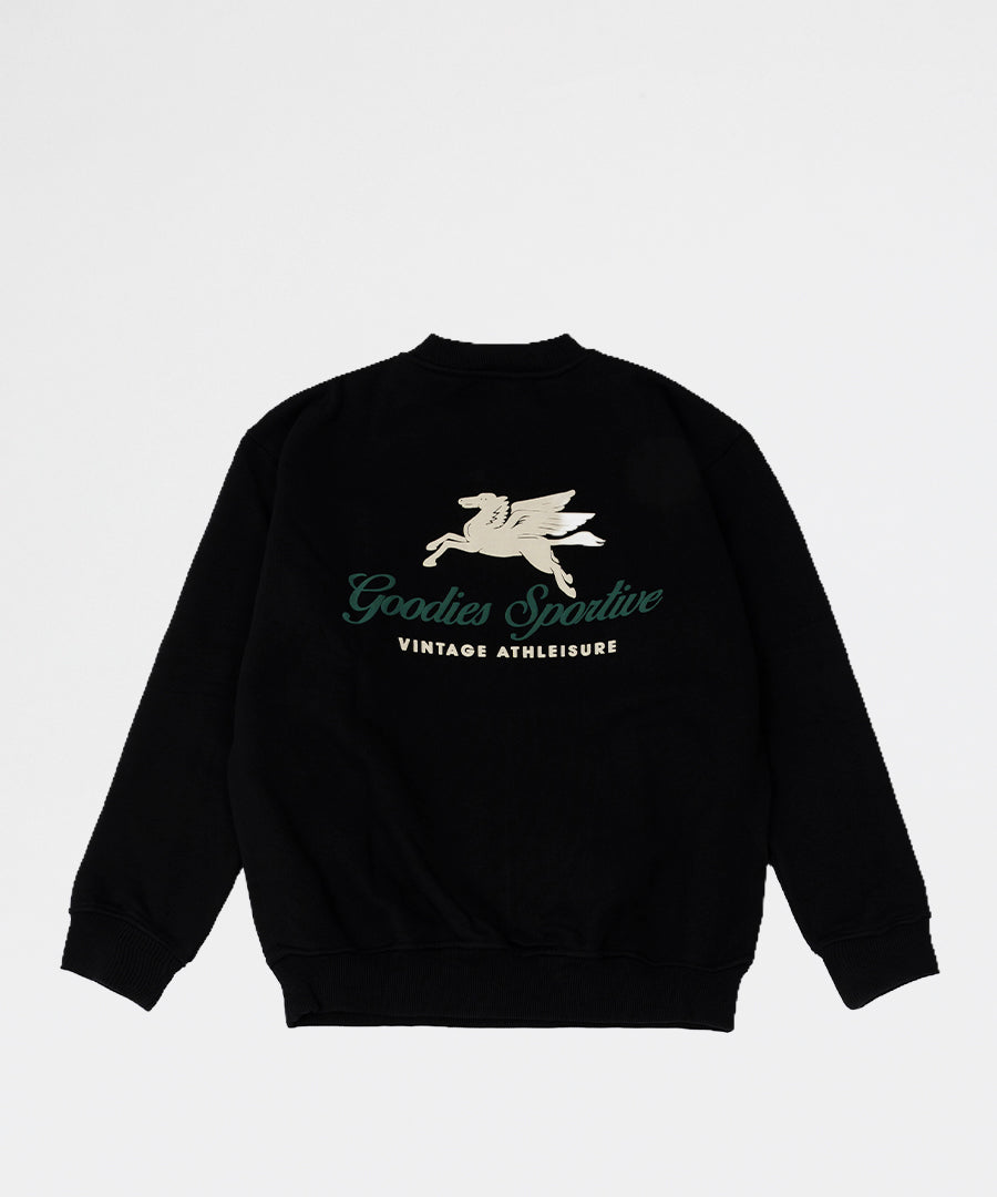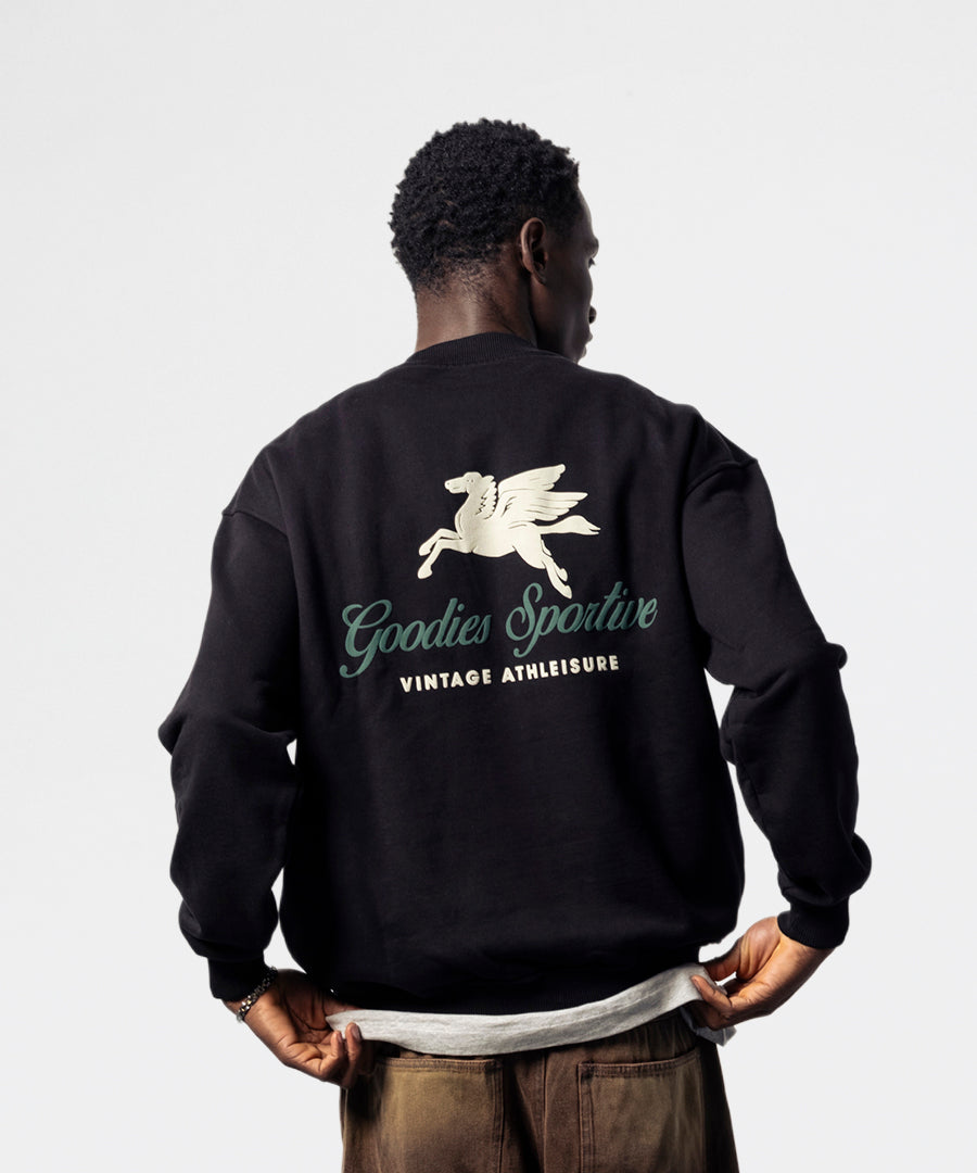 Premium crewneck sweatshirt fra Goodies Sportive i kraftig 550 grams kvalitet. Den sorte sweatshirt har et eksklusivt puff print design, der giver et moderne og streetwear-inspireret udtryk.