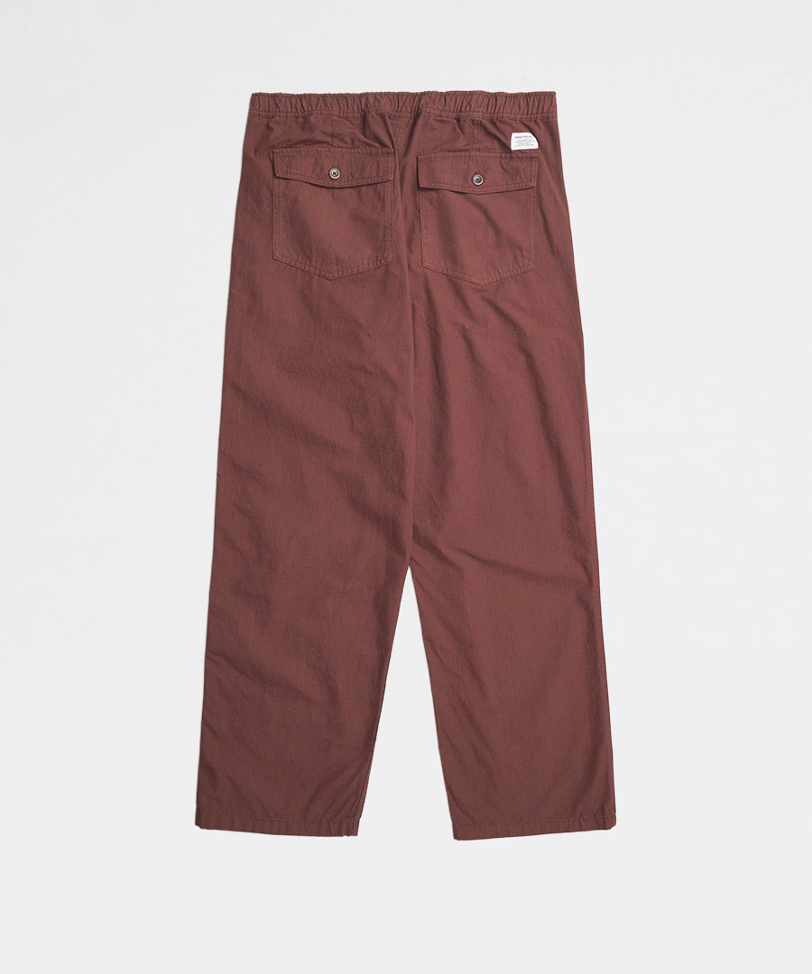 En afslappet pasform elastikbukser med vide ben, konstrueret i italiensk mellemvægts cotton ripstop og garment dyed for en dyb farve. Snørebånd sidder på indersiden af taljen, designet til at blive justeret og skjult væk. Har fatigue-stil lommer foran og bagpå, lynlås, knaplukning og mærket fane bagpå.