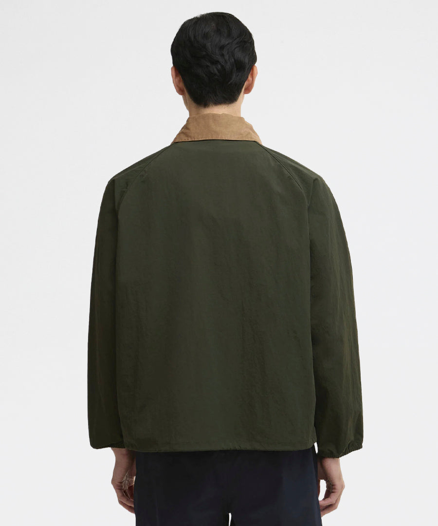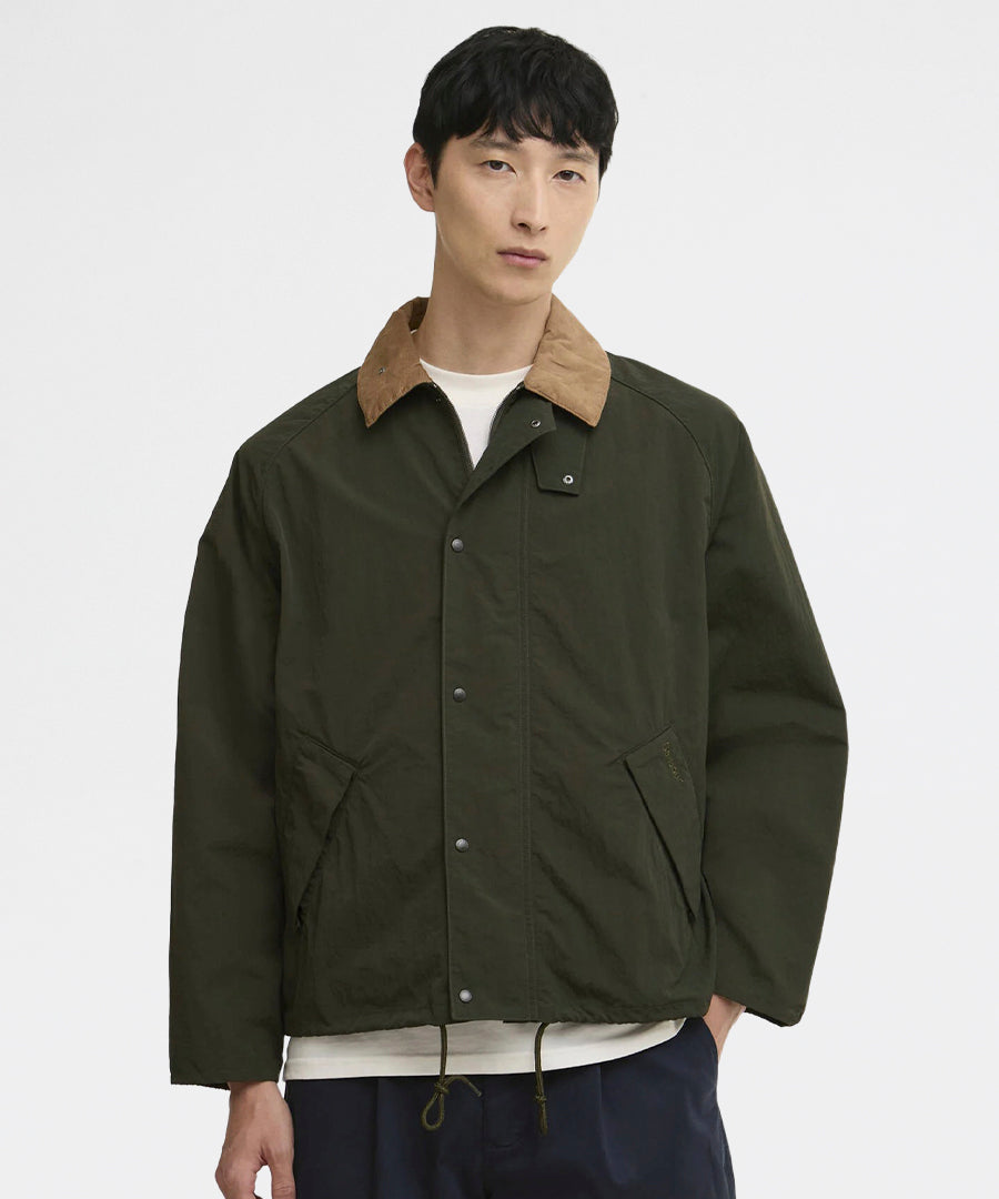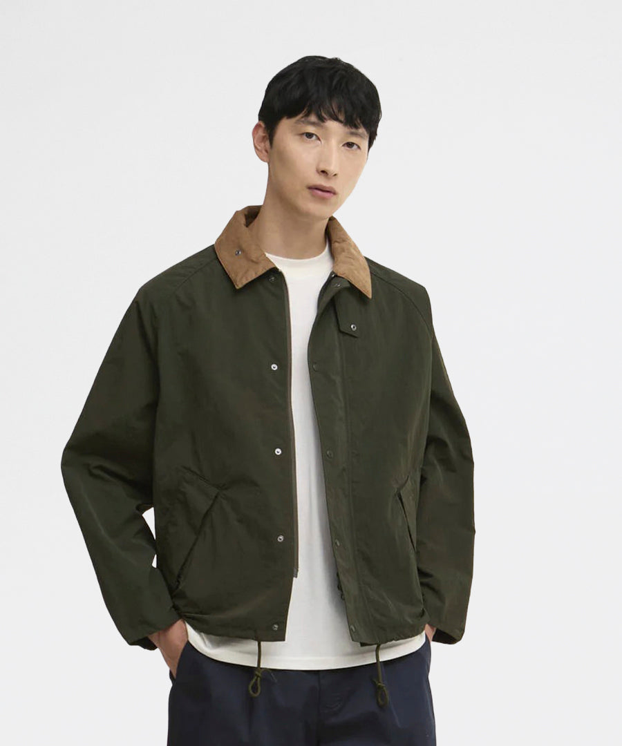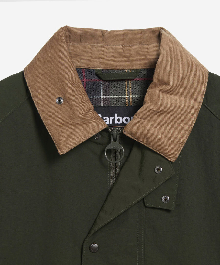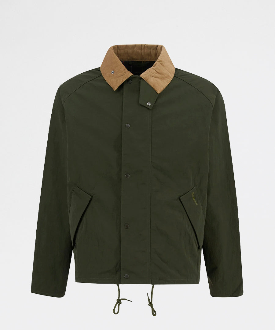 Barbour Transport Nylon Casual Jacket i Sage kombinerer funktionel design med tidløs stil. Baby cord-krave, zip-front med knap-placket og reverse welt-lommer skaber en raffineret profil. Elastiske manchetter og snøretalje i bunden sikrer optimal pasform, mens inner tartan-detaljer og tonal broderi på venstre lomme tilføjer autentisk Barbour-karakter. Oversized fit til den moderne garderobe.