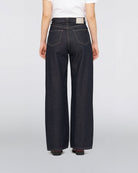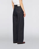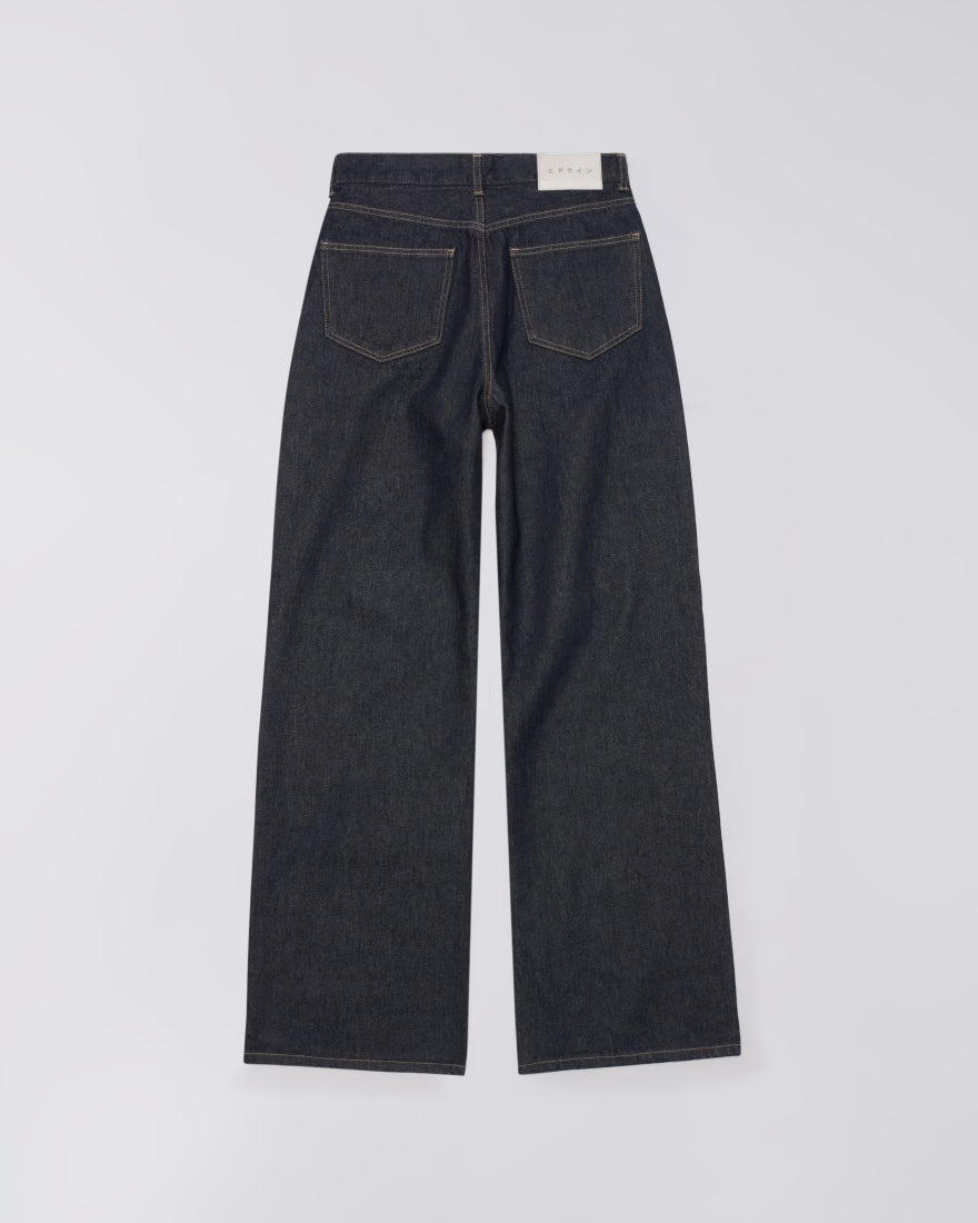 The EDWIN W' Olivia Pant is designed for a feminine silhouette with a relaxed fit, wide legs, and high rise. Made from 14.6oz Arctic Blue Denim (100% cotton), it offers comfort and style with contrast stitching and classic 5-pocket detailing. Finished with a polyurethane patch at the back waistband and sturdy rivets, this pant delivers casual elegance and durability.