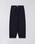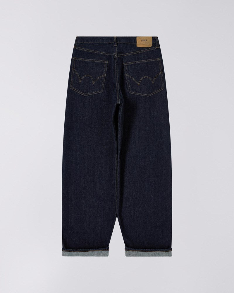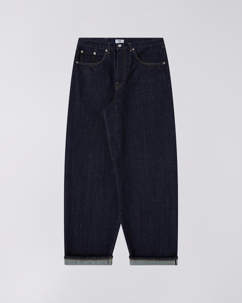 Edwin introducerer Wide Pant-Blue - Rinsed - Kurabo, et par jeans der kombinerer klassisk denim-tradition med nutidig mode. Disse bukser er fremstillet af 14 oz Kurabo Red Selvage denim i en indigoblå farve. De er designet til den kvalitetsbevidste forbruger, der værdsætter godt håndværk og funktionel stil.