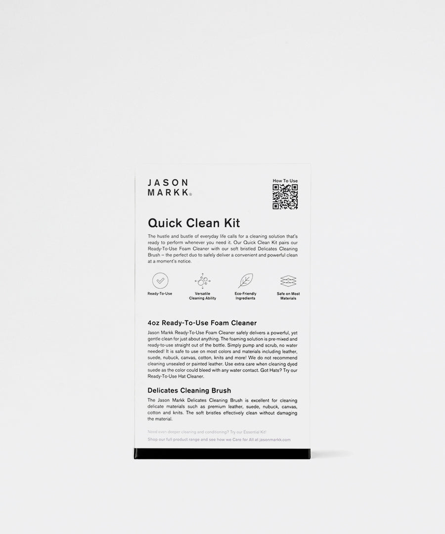 Kittet kombinerer Jason Markks Ready-to-Use Foam Cleaner med praktiske Quick Wipes, der giver dig mulighed for at rengøre dine sko hurtigt og nemt - hjemme eller på farten. Den forblandet formula sikrer optimal rengøring hver gang uden behov for vand.