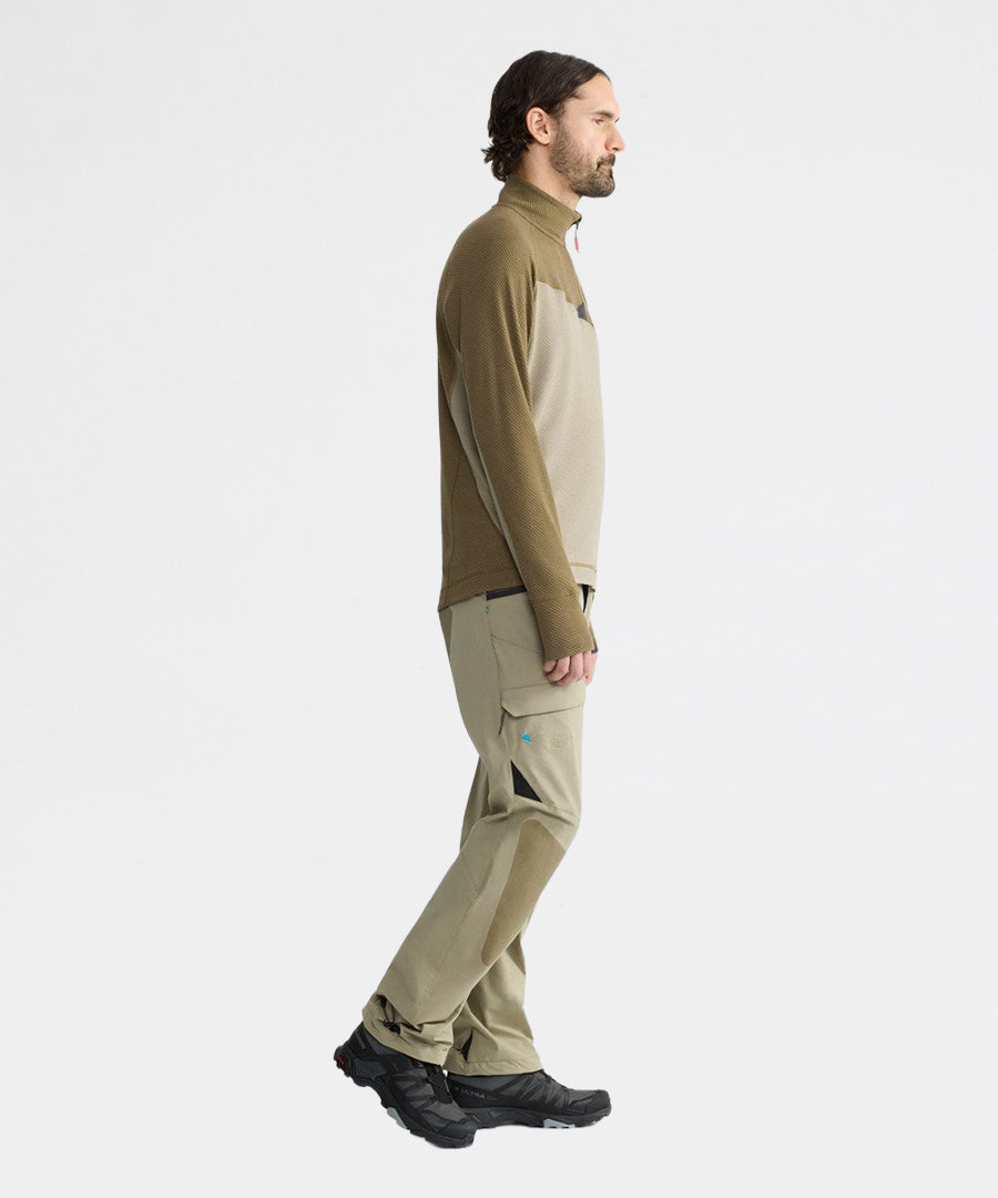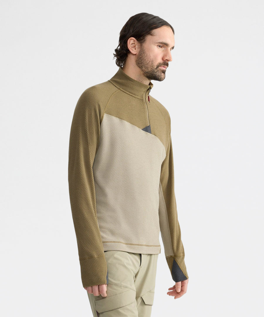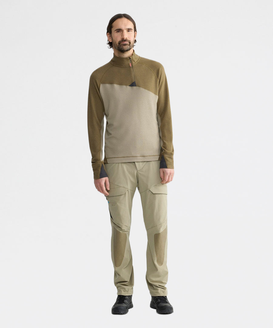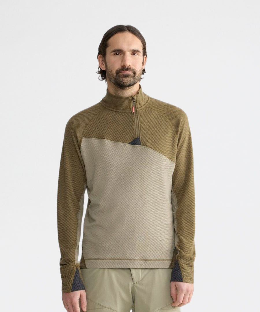 Huge er et let mellemlag eller baselayer til tempofyldte aktiviteter som ski-bjergbestigning, alpine klatring og hurtig trekking. Den er både varm og hurtigtørrende og designet til at blive båret komfortabelt med rygsække og shell-lag. Huge Half Zip Sweater er konstrueret af vores Norna® stof, der leder fugt væk fra huden og fordeler den for hurtig tørring, med en strukturel strikning der sørger for at danne luft tæt på huden for endnu hurtigere tørring og varme. Den har en semi half zip hals med tilføjet hagebeskyttelse og raglan-ærmer for en alsidig pasform.
