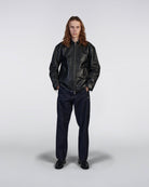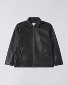 The EDWIN Fix Jacket is an oversized fit jacket made from 0.9/1.0 mm thick 100% cow leather. It features a double way metal zip front closure, two side pockets with metal zip closures, and metal zips on each cuff. Constructed as a leather shirt, it offers durability and structure through high-quality leather and reinforced hardware.