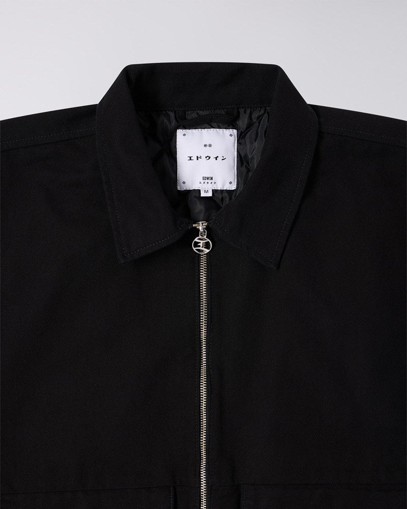The EDWIN Dogma Work Jacket is a regular fit jacket made from 370g/m² canvas (100% cotton). It features a front zip closure with a personalized zip head, two buttons on each cuff, two patched pockets at the front, workwear patches on the sleeves, and an Edwin tab label on the front pocket.