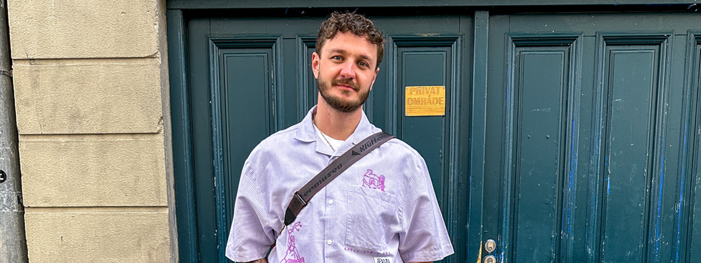 Sune bærer Edwin Reader’s Club Skjorte og Wide Pants i overfarvet sort og gul – en iøjnefaldende kontrast, der bringer klassisk streetwear ind i en moderne kontekst.