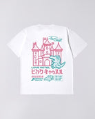 The Edwin Pink Castle T-Shirt er lavet af 160g/m² single jersey, 100% bomuld. Den har et oversized fit, grafiske tryk på både bryst og ryg, og en ribkrave for øget holdbarhed og struktur.